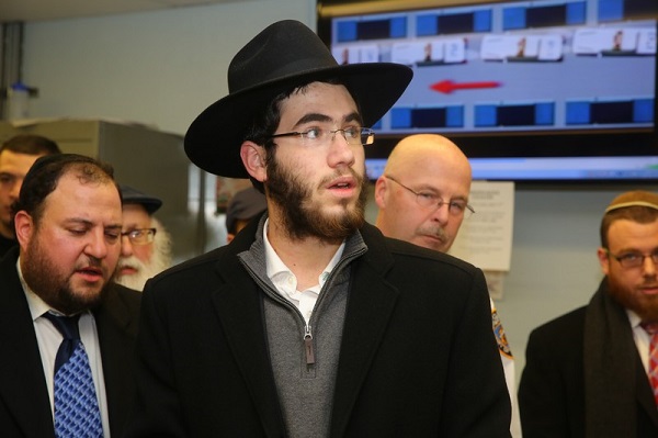 Levi Rosenblatt (R), a friend and an NYPD officer hear residents thank the NYPD for their ongoing bravery. Rosenblatt survived the Dec. 9 stabbing attack in the synagogue at 770 Eastern Parkway. Photo: Jewish Leadership Council.