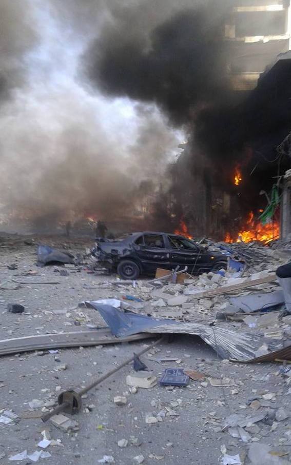 A photo from the scene of the explosion in Syria where a double car bomb killed 25 people. Photo: Twitter.