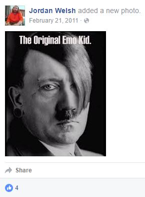 In 2011, Welsh posted an image of Hitler, to whom he referred as “The original Emo Kid,” a slang term that is sometimes used to describe people who do not care what others think of them.
